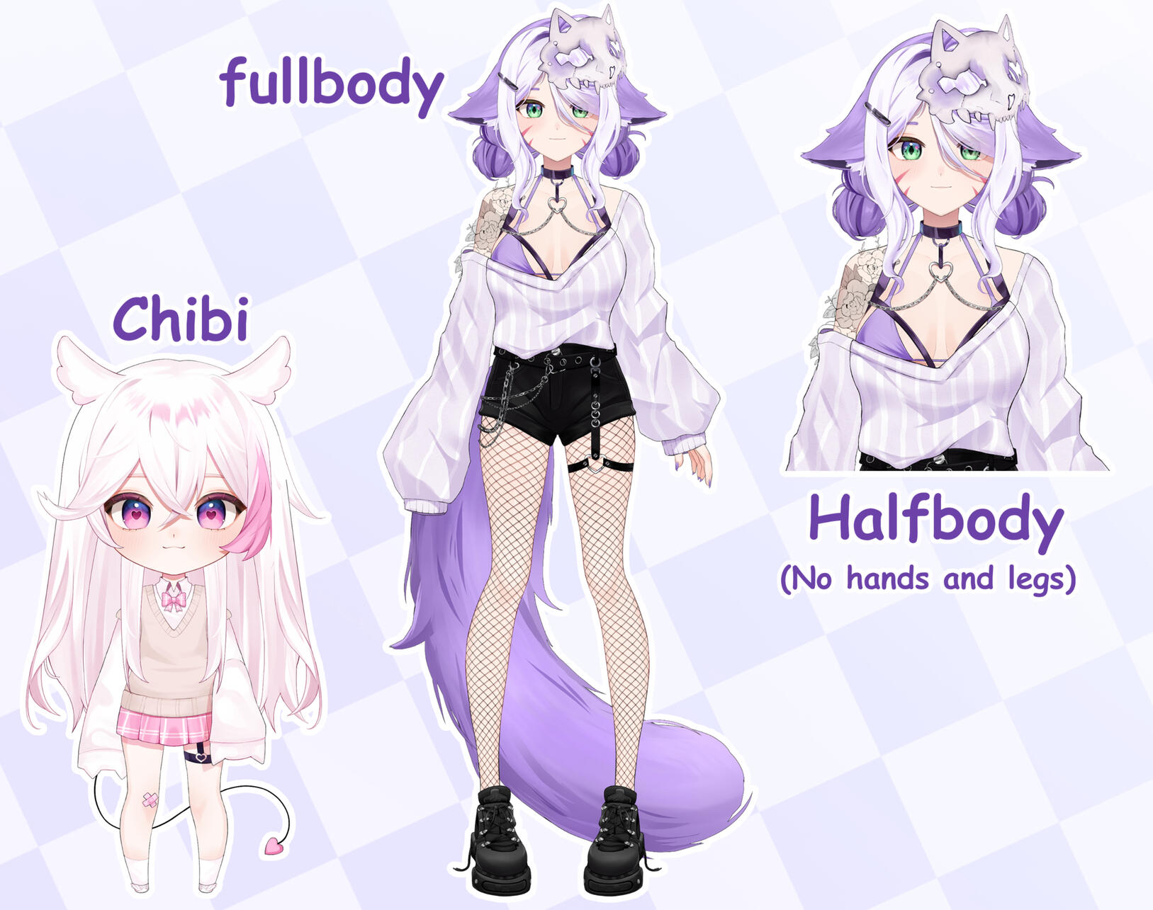 Terminologies:Toggle - hotkey to turn on a part, or play an animation .General Toggles - Anything that does not fall into the categories below. (e.g. taking off second outfit or one items, putting on glasses, changing hair style for exemple)Arm Based Toggle - Any toggles that require the switching of arm assets. Please note that the fee will increase if the arm toggle count exceeds 3 as it becomes exceedingly more time consuming to do quality control and to make sure things do not break.Animated Toggle - Includes looping animation (crying) or a toggle that requires its own unique physics, such as jiggly heart eyesAnimation - Keyframed animation that are playable via hotkey , for exemple : sleeping animation.IOS Package - IOS device, need a Iphone or facial motion capture.Vbridger - Mouth pucker, mouth funnel, mouth shrug, lip press, and jaw open. require the plugin Vbridger and an IOS device to use.Pets - Animals or other type of companion that requires its own physics and animations.